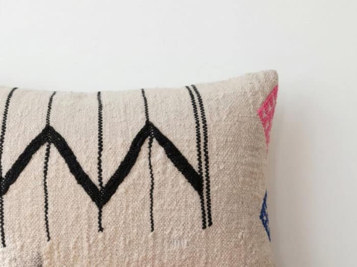 Woven on a natural cream foundation, this decorative lumbar pillow reveals a beautifully layered composition of pattern and color. A bold charcoal zigzag moves across the textile like a rhythmic thread, intersected by slender vertical lines that evoke the graphic simplicity of traditional tribal markings. Along the lower edge, delicate accents of mustard yellow, olive green, soft grey, and vibrant fuchsia appear like small woven symbols, while hints of cobalt blue and pink emerge along the side, giving the piece a lively yet balanced character.