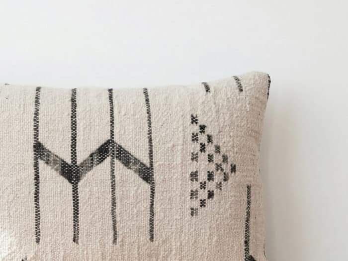 This rectangular Moroccan pillow celebrates the beauty of traditional textile craftsmanship through bold geometry and natural texture. Set against a soft ivory woven base, the charcoal motifs appear almost hand-drawn, creating a striking contrast that feels both modern and deeply rooted in tribal design traditions. Vertical lines, subtle grids, and symbolic chevron shapes form a composition that feels spontaneous and expressive.