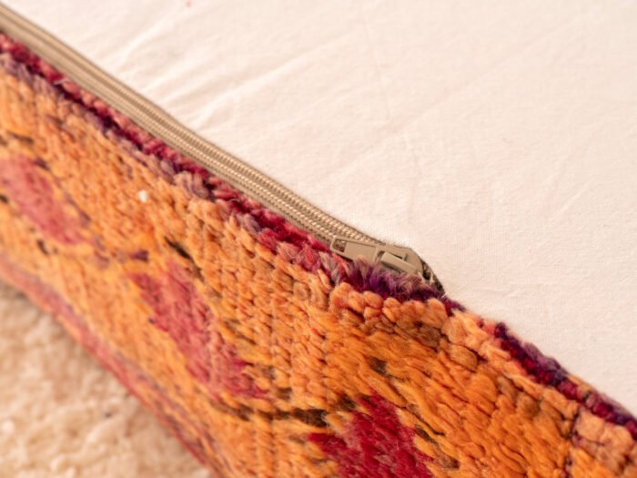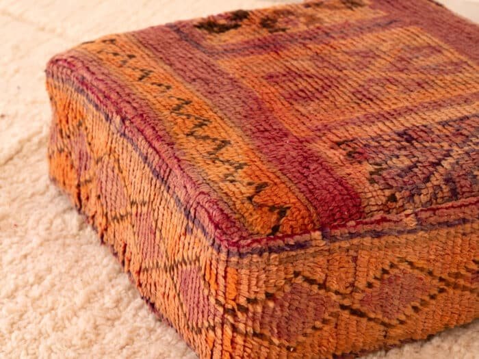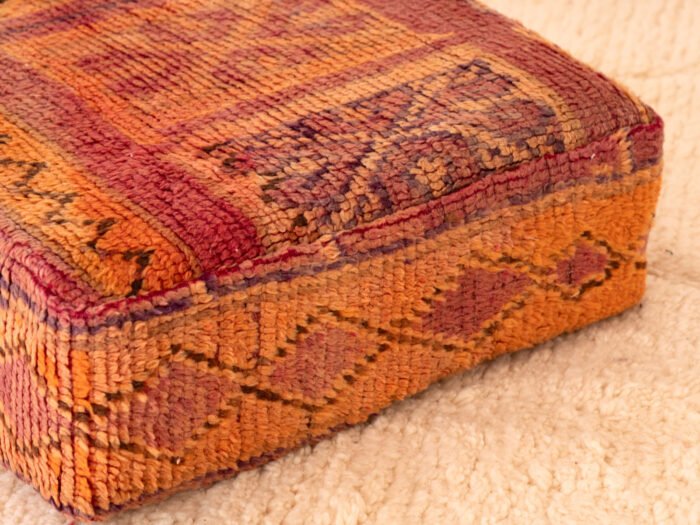 A one-of-a-kind vintage Berber wool pouf crafted from an upcycled Moroccan rug, blending sunset tones, symbolic diamond motifs, and plush hand-spun wool for authentic bohemian warmth.