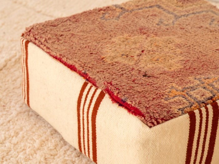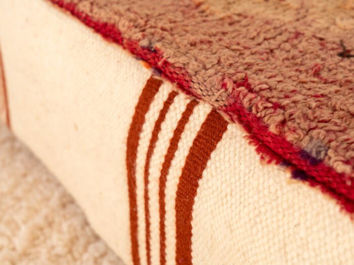 A vintage Berber pouf with a faded red rug top and cream flatweave sides accented with rust stripes, combining rustic charm and authentic Moroccan craftsmanship.