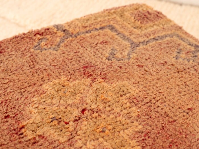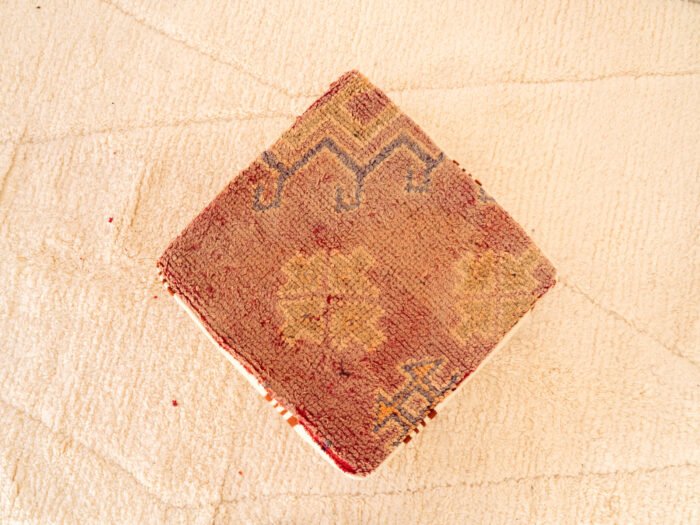 This vintage mixed-textile Berber pouf celebrates the beauty of aged textiles, blending rustic charm with refined Moroccan craftsmanship. The top panel features a deeply faded red background, adorned with subtle tribal motifs in pale blue-grey and muted tan. The worn, distressed surface embodies the authentic “wabi-sabi” aesthetic, showcasing its rich vintage heritage.