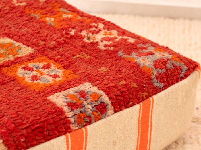 Upcycled Moroccan Red Rug Pouf with Tangerine Stripes