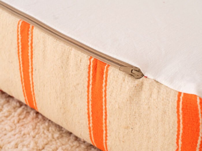 The sides offer a crisp contrast in natural cream flatweave, accented with bold vertical tangerine stripes. This playful combination of warm and bright tones creates a dynamic, eye-catching statement while maintaining balance and sophistication.