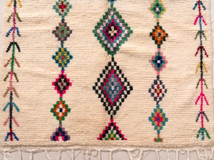 This Large Rug White, distinguished by its vibrant colours and symbols embroidered on a light base, comes from the enchanting Azilal region, renowned for its traditional craftsmanship.