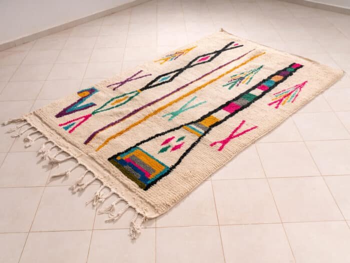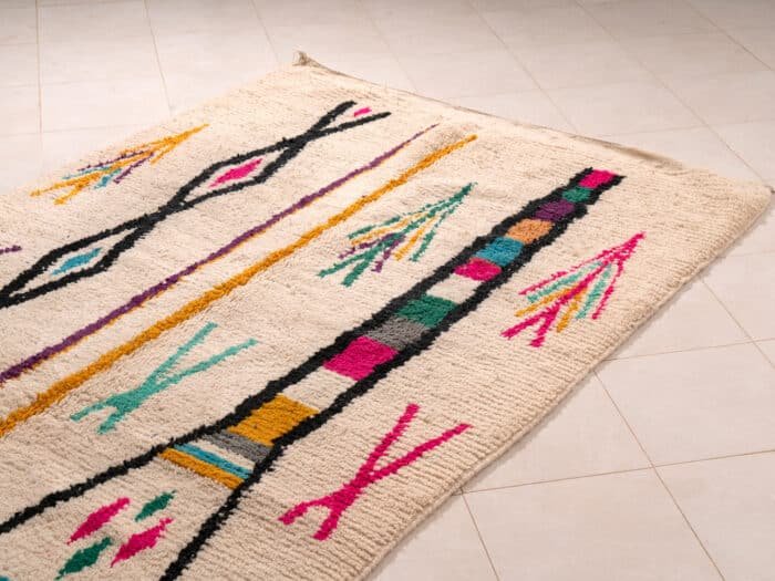 This Abstract Berber Carpet , distinguished by its vibrant colours and symbols, comes from the enchanting Azilal region, renowned for its traditional craftsmanship.