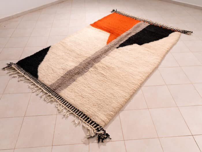This Rug showcases various colours, from white to black, bold orange and gray: a very creative combination!
