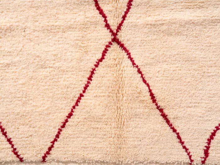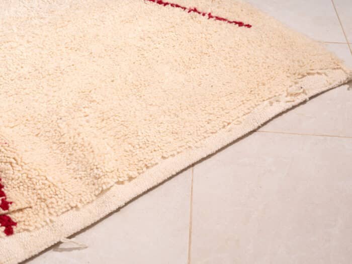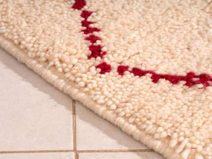 This Modern White Red Carpet is an authentic Beni Ourain made of wool and crafted by Moroccan skilled artisans from the Atlas Mountains .