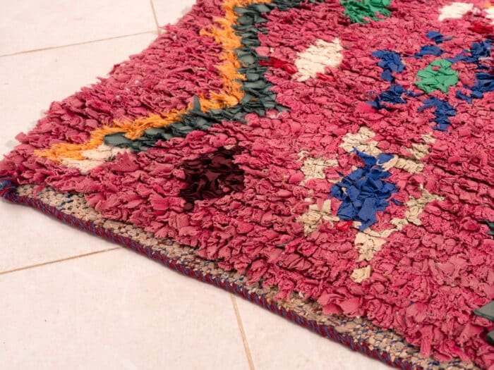 This Boucherouite is a vibrant and environmentally friendly rug handcrafted in Morocco. It can decorate the floor or the wall adding a touch of exotic beauty to any space.