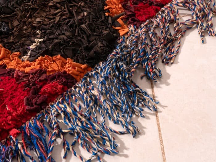 The rug’s construction not only highlights the artisans’ skill but also supports sustainable practices by repurposing materials that would otherwise go to waste.
