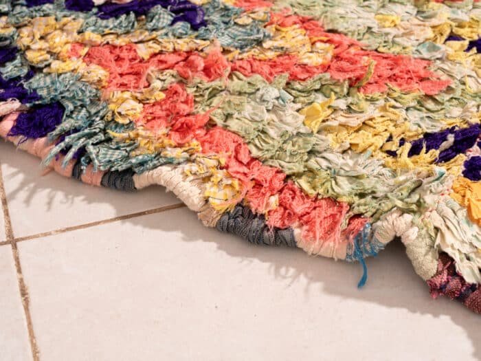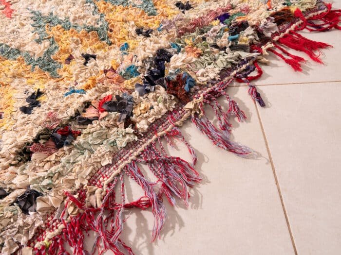 This Boucherouite Rug is a vibrant and environmentally friendly rug handcrafted in Morocco. It can decorate the floor or the wall adding a touch of exotic beauty to any space.