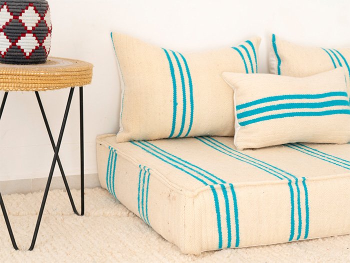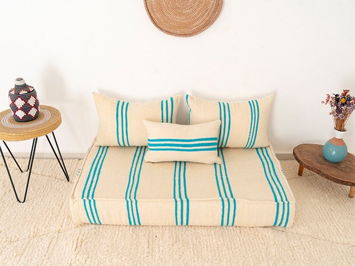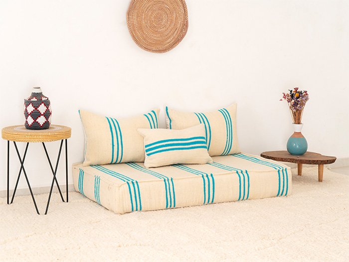 Refresh your living space with our Handmade Sky Blue Stripes Moroccan Floor Sofa, designed to bring both comfort and modern elegance to your home. Its bold blue striped pattern creates a vibrant focal point that instantly uplifts and harmonizes any room.