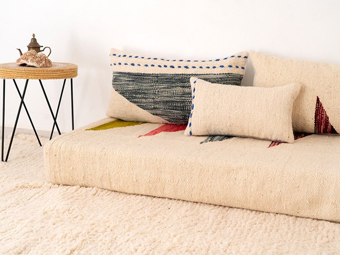 Handwoven wool floor sofa in warm abstract kilim patterns, perfect for low seating, cozy reading corners, and boho living rooms, adding soft Moroccan charm to any modern home.