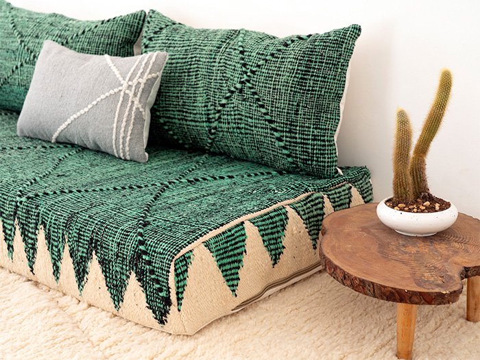A handwoven green Zanafi floor cushion with a matching grey pillow, bringing relaxed Moroccan elegance, comfort, and a cozy lounge feel to your living space.
