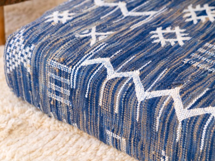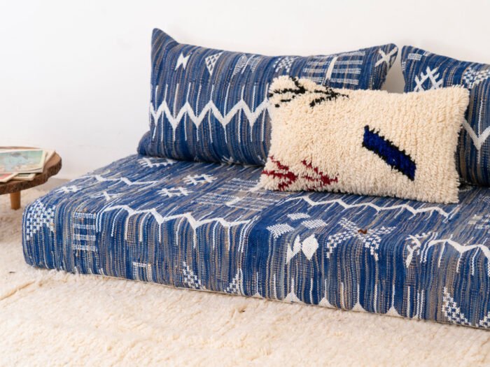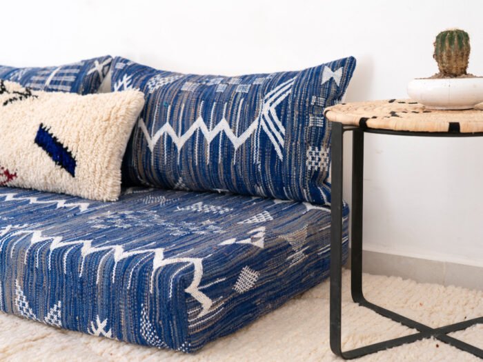 Evoking the tranquil rhythm of slow living, this handmade blue kilim sofa is a tribute to Moroccan textile heritage. Carefully handwoven by skilled artisans, it reflects generations of knowledge passed down through patient hands and creative spirit.