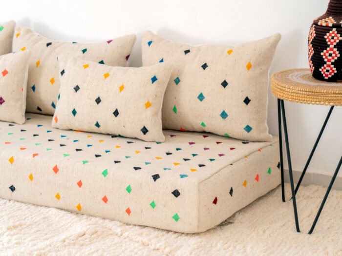 These Moroccan Floor Couch Covers are a perfect blend of modern design and authenticity. The wool material provides a contemporary look, while the pattern adds a touch of character. It is the ideal addition to any seating and living space.
