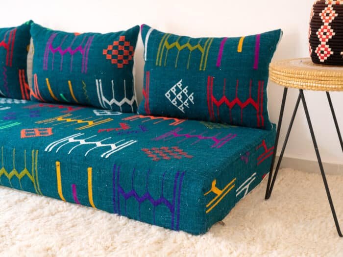 This Moroccan Floor Couch is a perfect blend of modern design and authenticity. The durable wool material provides a contemporary look, while the colourful patterns add a touch of playfulness and character.