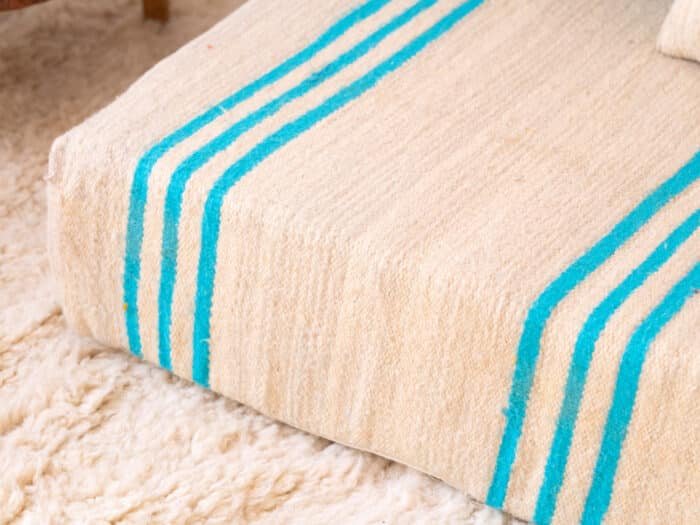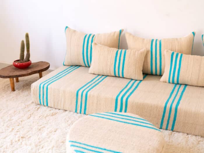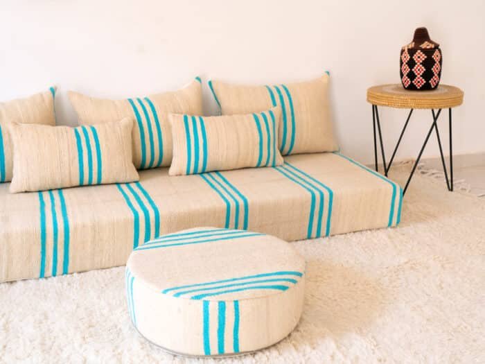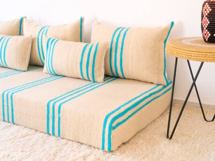 This Floor Couch Set Light Blue, handmade in Morocco, it is perfect for having a lovely and warm cosy corner in your house. It also serves for who is looking for a low budget setting area or a reading nock.