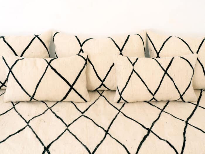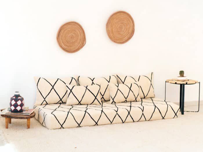 A handcrafted Moroccan kilim floor sofa in crisp white with bold black diamond patterns, offering expansive comfort and bohemian elegance for relaxed, low-profile seating.