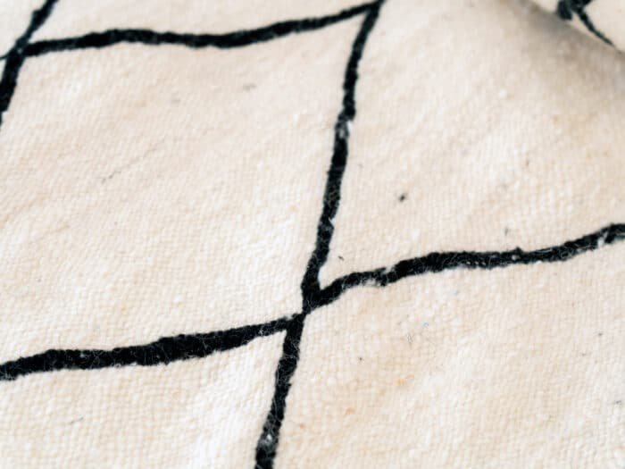 The crisp white kilim is adorned with a striking black diamond lattice pattern, offering high-contrast visual appeal while remaining neutral enough to harmonize with any decor. Each line showcases subtle artisanal variations, highlighting the handwoven nature of the piece.