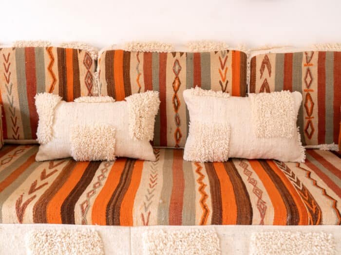 This Moroccan Floor Couch is a perfect blend of modern design and authenticity. The design of the textile provides a contemporary look, while the colourful patterns add a touch of playfulness and character.