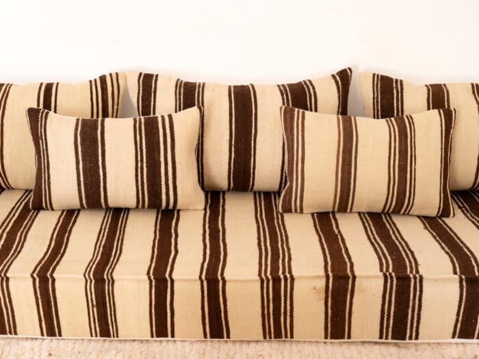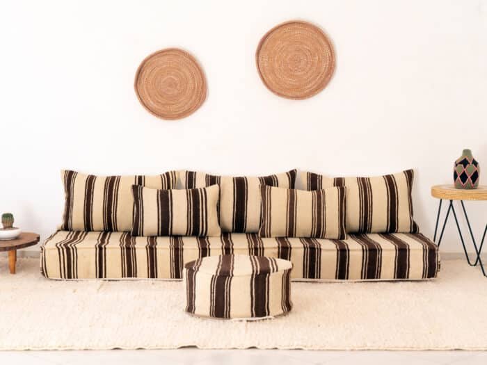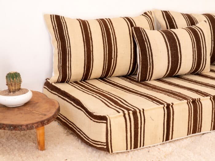 Designed in the traditional Moroccan low seating style, this sofa creates an atmosphere of calm and intimacy. Its generous size invites moments of rest, conversation, and quiet reflection, while the textured blanket weave offers both durability and softness. The harmonious rhythm of the brown stripes adds depth without overwhelming, making it a versatile piece for refined, natural interiors.