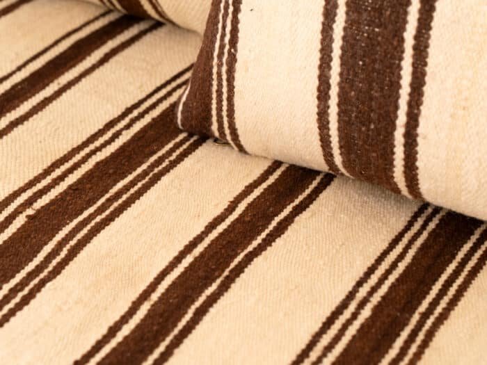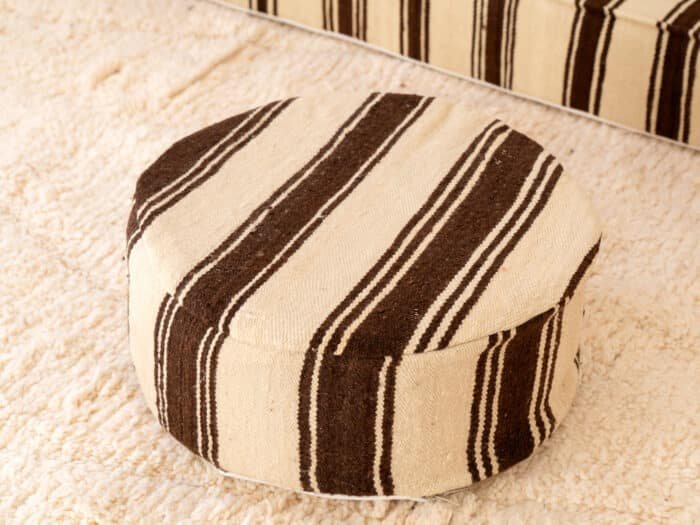 Inspired by the raw beauty of Moroccan landscapes, this 210 cm blanket sofa and matching round pouf embody warmth, balance, and enduring craftsmanship. Handwoven by skilled artisans, the natural ivory base is enriched with deep brown stripes, echoing the tones of desert earth and sun-baked clay.