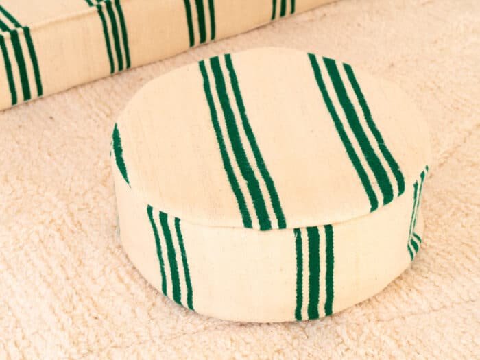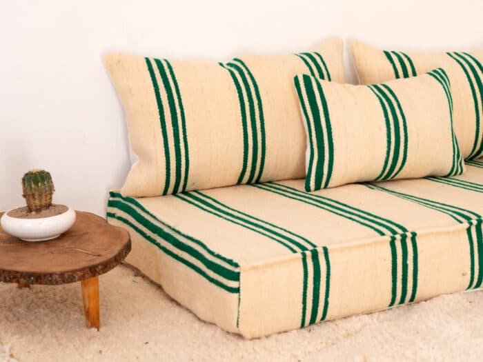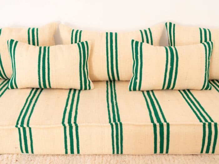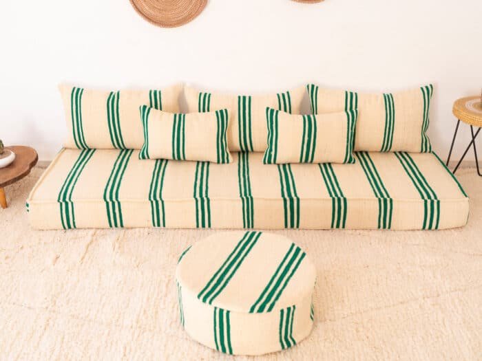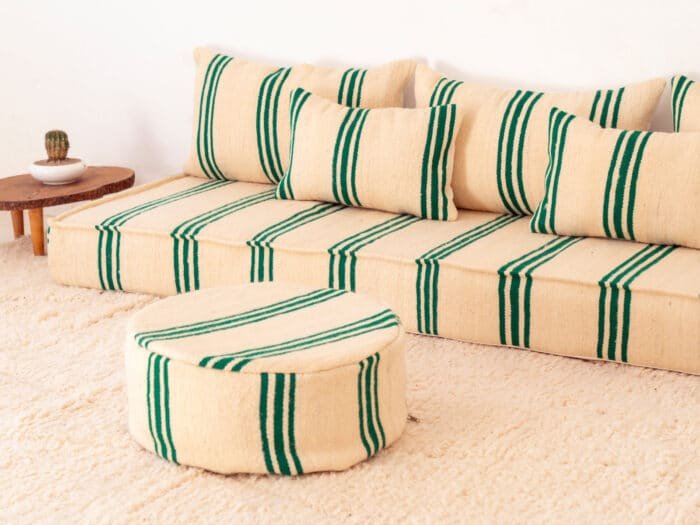 Handwoven Moroccan Blanket Sofa and Pouf Set in Ivory and Green Stripes