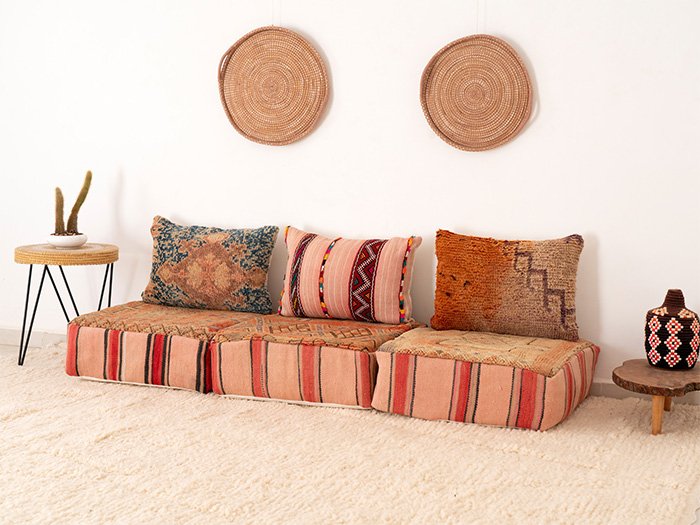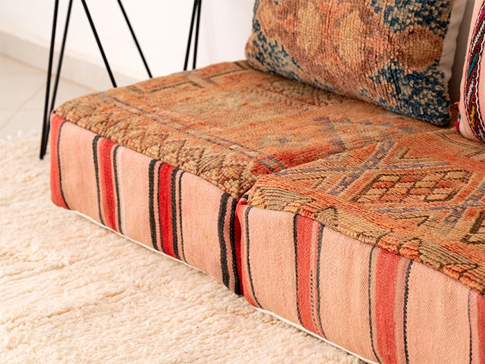 We’re excited to present a very special product and the first of its kind in Morocco: a traditional Moroccan handmade rug floor couch. Perfect for creating a warm, cozy, and charming oriental corner, this floor couch is also ideal for anyone looking for stylish seating on a budget. Lightweight, easy to move, and simple to clean, it can be arranged in multiple ways—L-shaped, or with each piece placed in different rooms or corners.