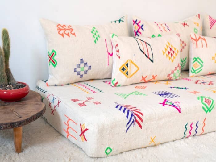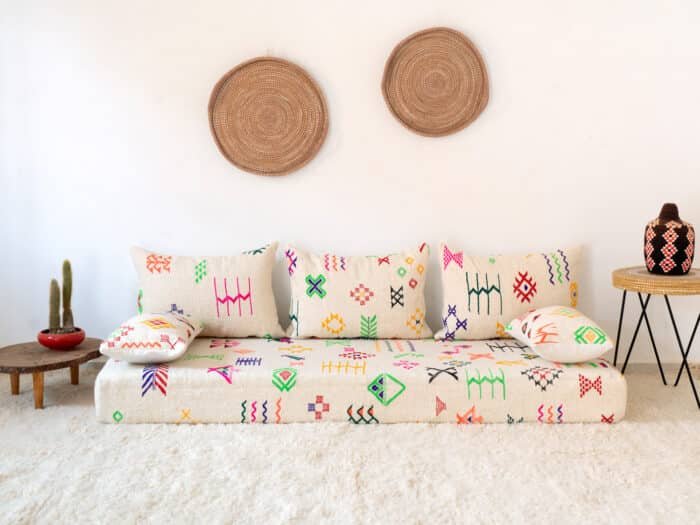 This Moroccan Floor Couch is a perfect blend of modern design and authenticity. The durable wool material provides a contemporary look, while the colourful patterns add a touch of playfulness and character.