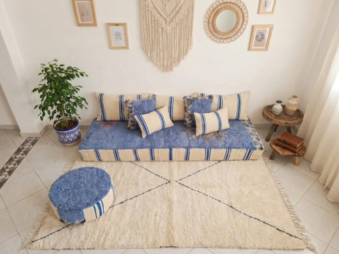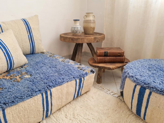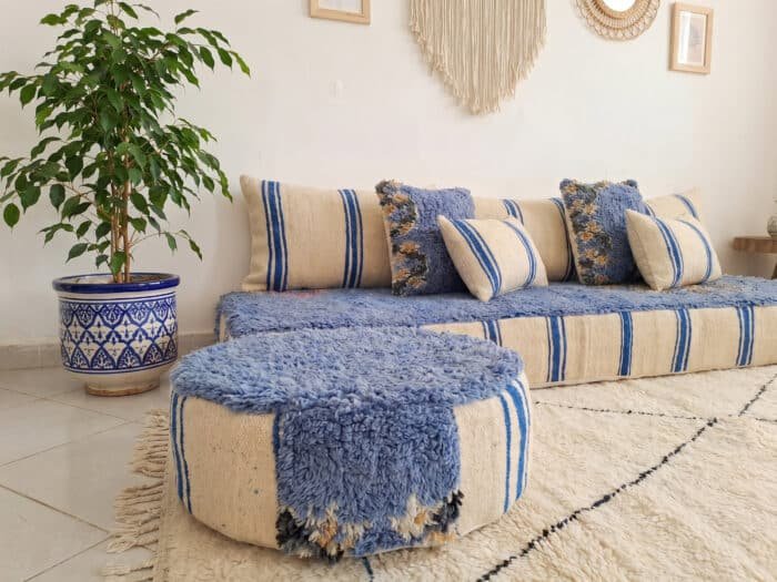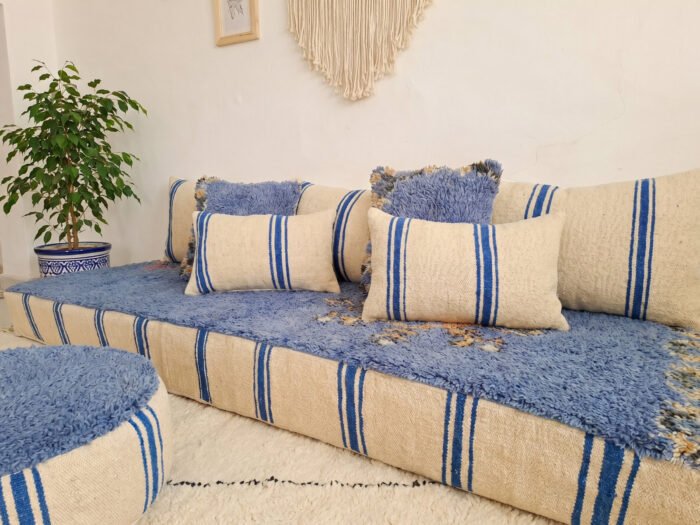 Artisans wove this moroccan floor sofa entirely by hand. They used a dense flat-weave technique rooted in centuries of Moroccan textile tradition. Bold cobalt blue stripes run across an off-white wool ground. These stripes create a strong visual rhythm that anchors the whole set. Additionally, this stripe motif draws directly from the dyed wool markets of ancient Moroccan medinas.
