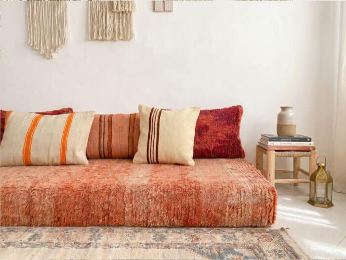 Woven by hand in the tradition of Moroccan artisans, this terracotta floor cushion carries the warmth of sun-baked earth and the depth of aged wool. Its generous, low-profile form invites long afternoons of unhurried rest, while the accompanying kilim pillows layer the scene with color and quiet artistry.